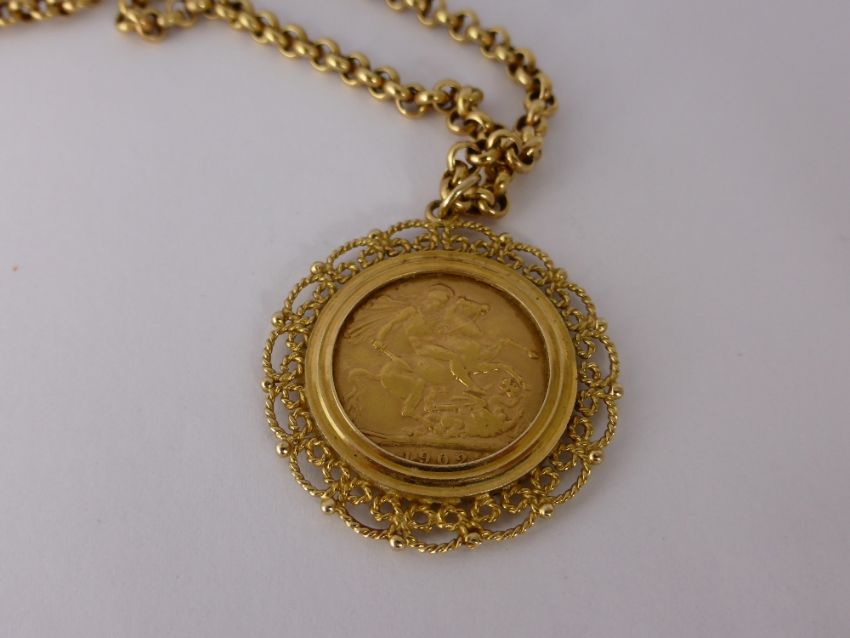 An Edward VII 1902 Full Sovereign, in 9 ct gold mount on 9 ct gold chain (9 ct approx 8 gms).