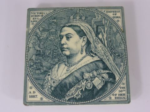 A Minton China Work Teapot Tile Stand, depicting Queen Victoria together with 1837 - 1887 Jubilee plate.
