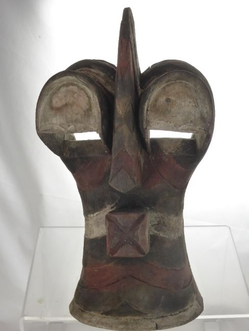 A Sub-Saharan African Tribal Mask, the ochre and kaolin mask depicting half-man, half-beast, with heavy hooded eyes and decorative carving, approx 33 x 38 cms.