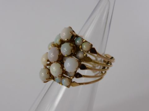 A Lady's 14 ct Gold and Opal Dress Ring, each individual ring is joined at the base with fine wire, to create an overall cluster effect, approx size I.