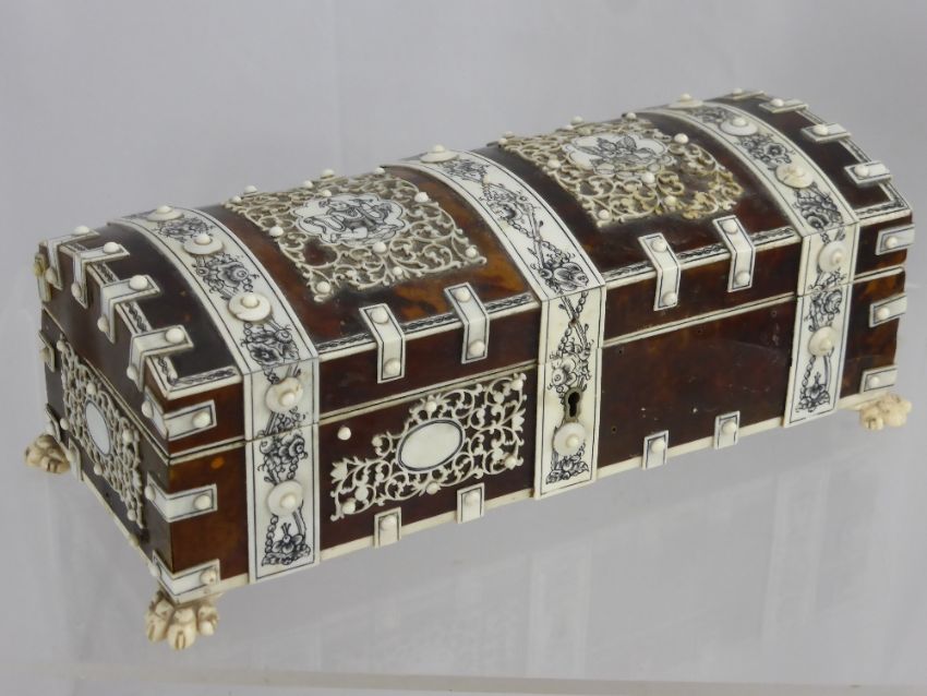 An Antique Oriental Schrimshaw Tortoiseshell Veneered Casket, the casket having floral and deity design bands and stud work.on claw feet, approx 22 x 8 x 8 cms.