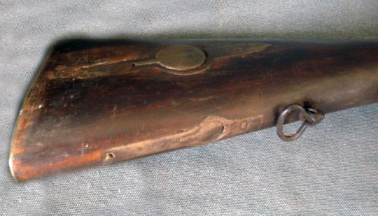 A 19th Century Musket. semi pistol grip stock with brass fittings, hinged wadding and bullet holders let into stock, 35 inch barrel with full length fore-end fitted with sling swivels, including ramrod.
