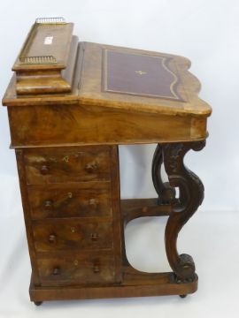 A Walnut Davenport with gilt tooled red leather insert, four interior drawers, four side drawers and four dummy drawers, pen box with decorative brass gallery, approx 55 x 59 x 86 cms.