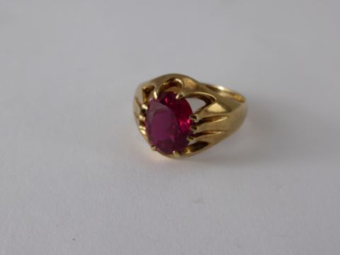 A Gentleman's 9 ct Gold Pink Solitaire Synthetic Ruby/Spinel Ring, size Q, approx 5 gms.