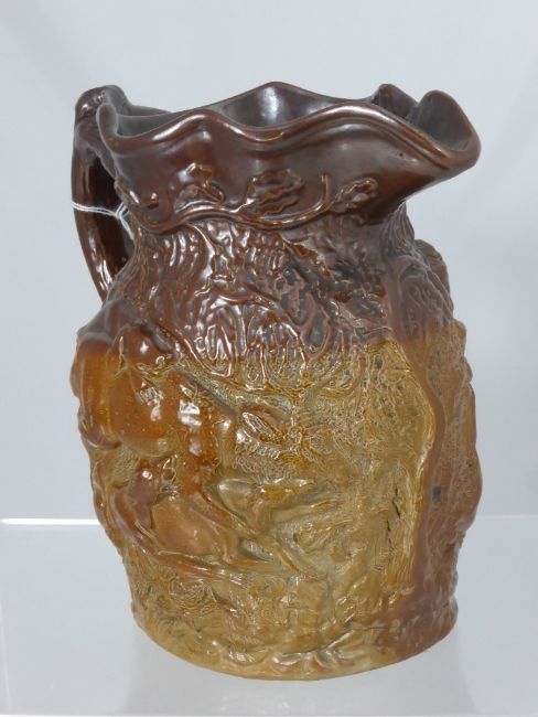 An Early 19th Century Doulton & Watts Lambeth Pottery Hare Jug, the treacle and brown glaze jug having an oak branch form handle depicting a hunt of wild boar and stag, approx 20 cms