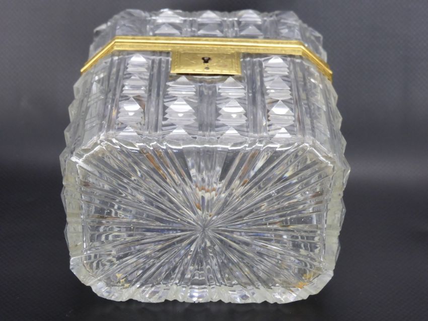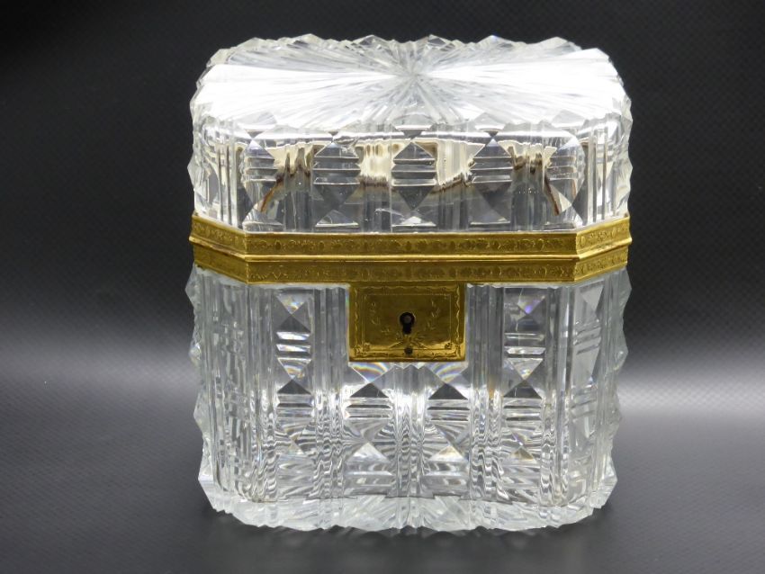 An Antique French Cut Crystal and Ormulu Sugar Caddy, with star burst design to base and lid, approx 11.5 x 8 x 9 cms.