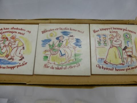 A Set of Six Vintage German Character Porcelain Tiles, depicting various comical marriage scenes.
