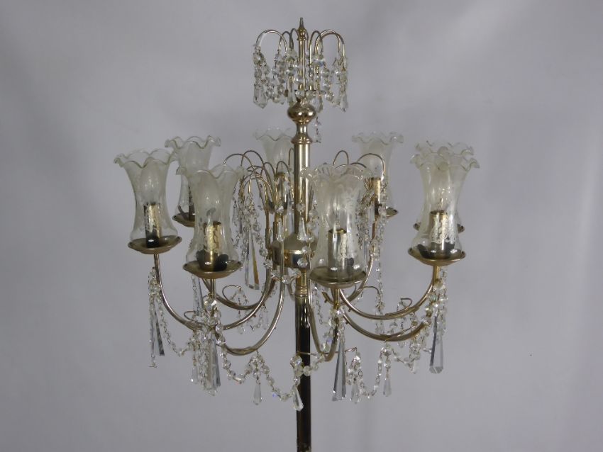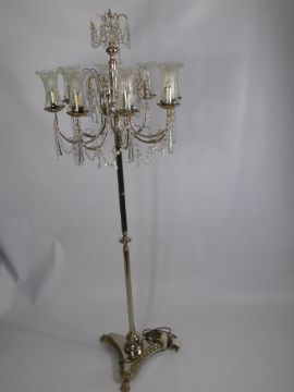 A Silvered and Cut Glass Lamp Stand, the lamp stand having cut glass droplets to centre with eight lights to side on claw feet.