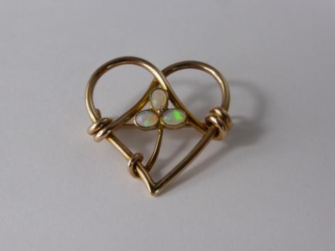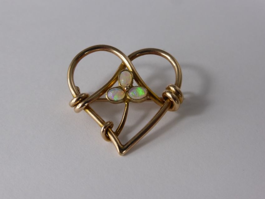 A Lady's 9 Ct Gold and Opal Heart Shaped Brooch, four 4 x 3 total wt 4.4 gms.