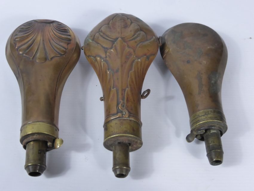 Three Antique Powder Flasks of various designs, two common top, one patent top by James Dixon. (3)