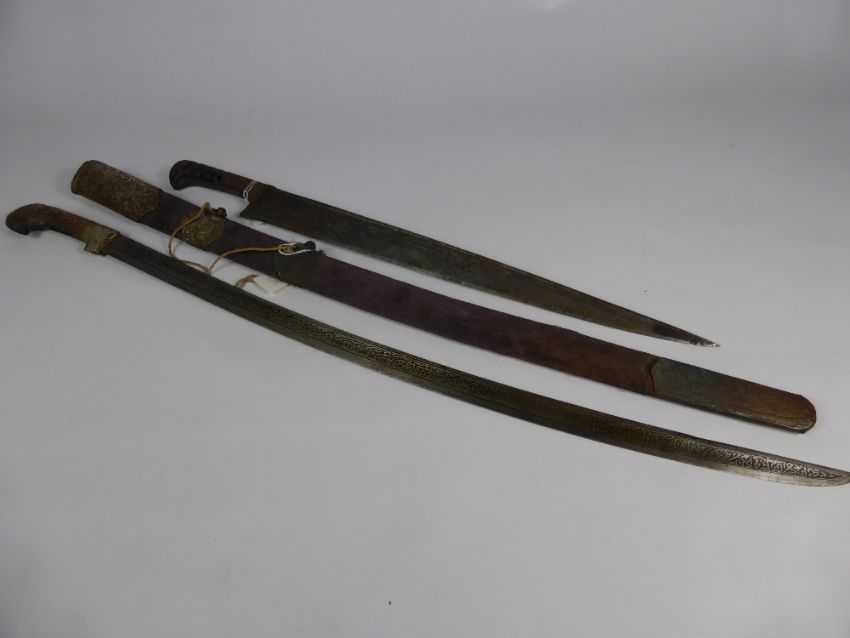Two Antique Caucasian Swords, one having wooden hilt without scabbard approx 59 cms, the other similar with metal hilt with velvet scabbard and curved blade, approx 79 cms. (2)