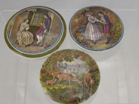A Quantity of 19th Century Pot Lids, two depicting lovers, one a woodland scene and the other a porcelain trivet of Uncle Toby and the Widow. (4)