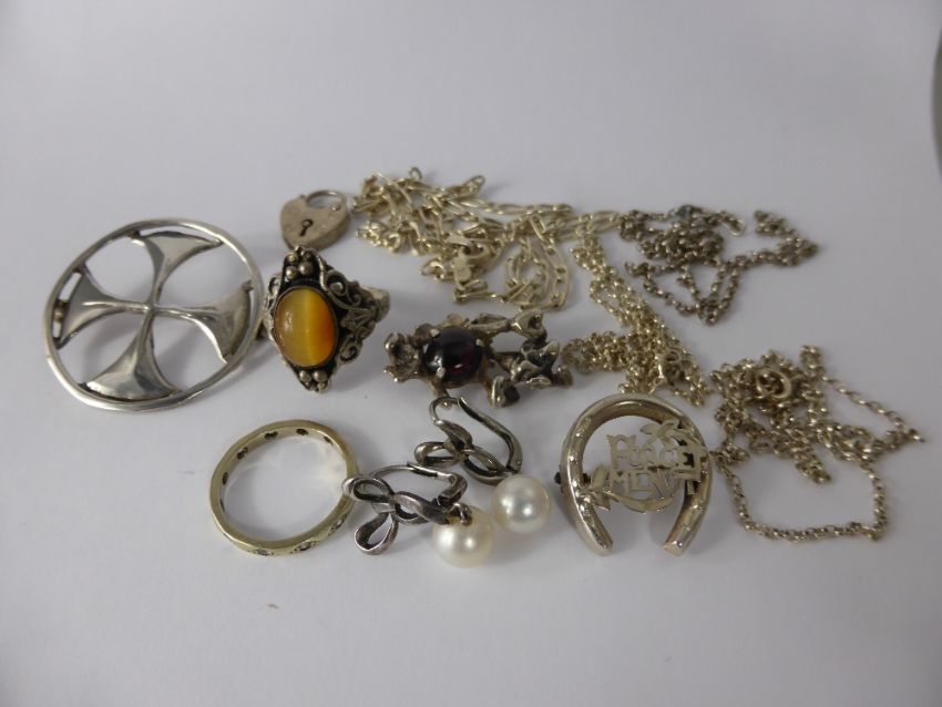 A Miscellaneous Collection of Silver and Other Jewellery, including Celtic cross brooch, mm OMG, silver and pearl earrings, 4 chains, cat's eye ring, approx total wt 36 gms.