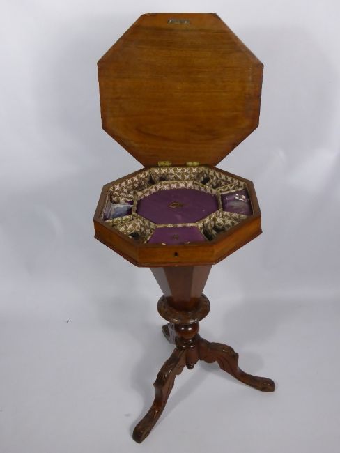 A Octagonal Walnut Veneer Sewing Table, decorative inlay and contents, carving to turned supports and legs, approx 43 x 45 x 70 cms.