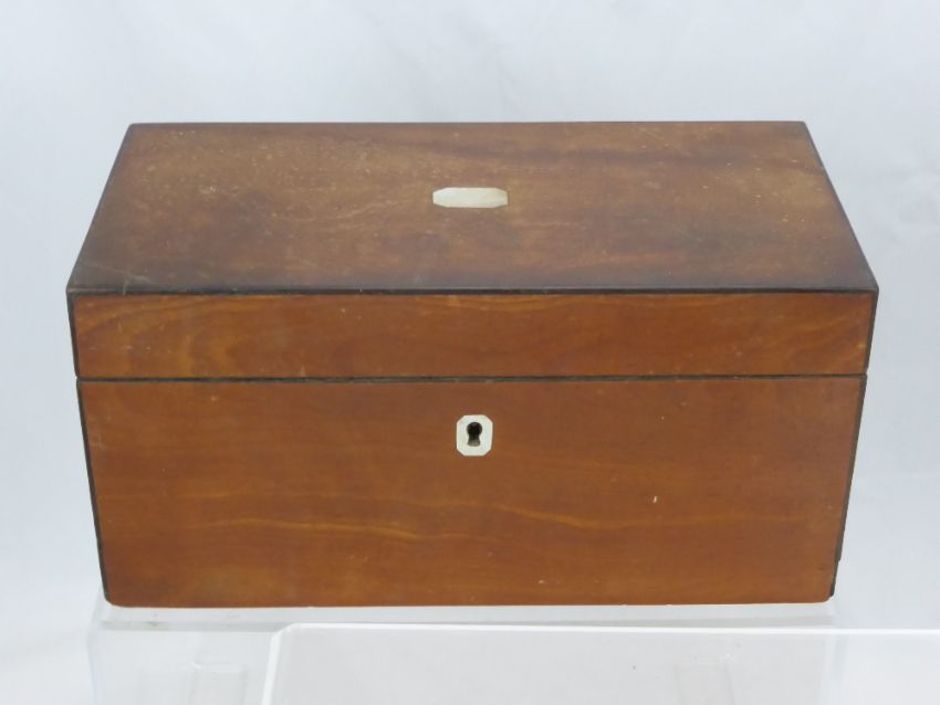 A Mahogany Inlaid Tea Caddy, with fitted interior, turned carry handles, approx 25 x 13 x 15 cms together with a mahogany tea caddy with cut glass mixing jar, approx 28 x 15 x 15 cms.