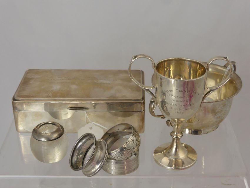 An Alfred Dunhill Silver Cigarette Box, London hallmark, dated 1937 together with an Alex Clark sugar bowl and various other silver items including a match strike, trophy, two napkin rings and a silver Georgian tablespoon dated 1809, mm Peter and William Bateman. (13)