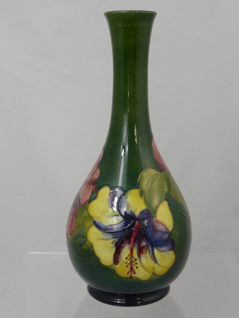 A Moorcroft Slim Neck Vase, 'Hibuscus design', with Royal Warrant label to verso, 'Potters to the Late Queen Mary', approx 36.5 cms