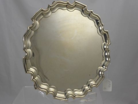 A Silver Salver, with decorative pie crust edge on three scroll feet. Sheffield hallmark, mm Walker & Hall, approx 30 cms diameter, approx 860 gms