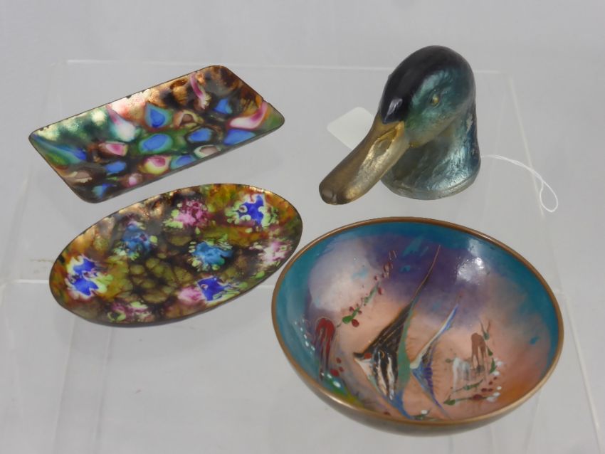 An Antique French 'Ducky' Kirby Beard & Co Bottle Opener, together with two unusual glass enamel trinket dishes. (3)