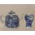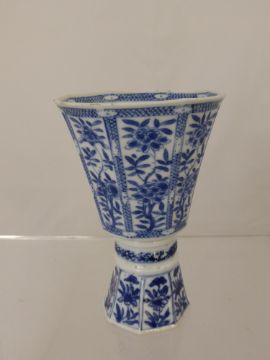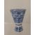 An Antique Blue and White Chinese Porcelain Stem Cup, the cup raised on stem foot, the bowl segmented with flowering peony, a stylized flower head in the bottom of the interior, approx 12 cms together with a Chinese blue and white miniature tea pot, with hand painted foliate decoration together with a miniature Chinese blue and baluster vase. (3)