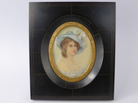 A Pair of Antique Portrait Miniatures, painted on ivory, depicting a military officer and a beautiful young woman, both in ebonized frames. (2)
