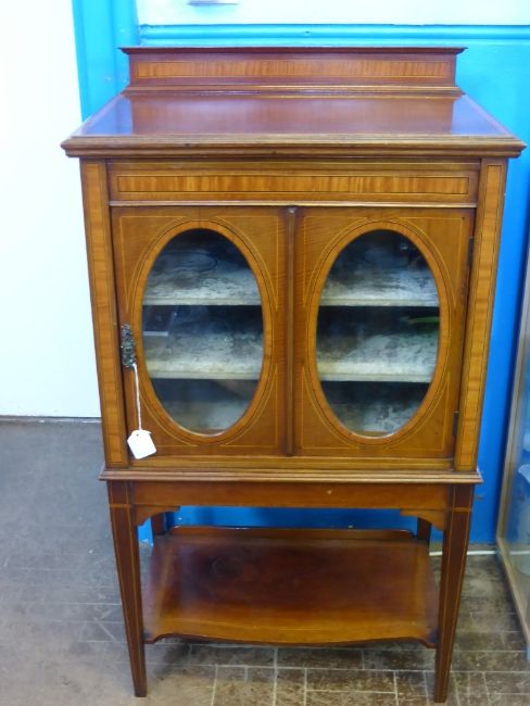 An Antique Mahogany Music Cabinet, oval glazed fronted door, the cabinet has three internal shelves and a shelf beneath, with decorative box inlay supported on tapered legs, approx 104 x 59 x 39 cms