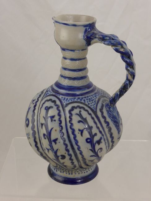 An Antique German Stone Ware Pottery Ale Jug with decorative blue floral design with pie crust handle, approx 30 cms high.