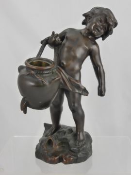 After Auguste Moreau (1834-1917), A Bronzed Water Carrier, modelled as a small boy carrying a pitcher of water, incised 'Aug Moreau', Paris foundry mark, approx 32 cms