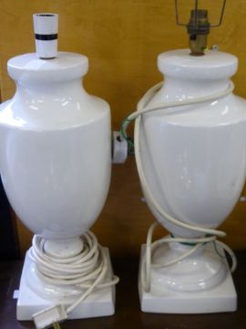 A Pair of Vintage White Porcelain 'Casapupo' London Table Lamps, in the form of urns, approx 42 cms h together with one other Chinese style table lamp, with a quantity of lamp shades. (3)