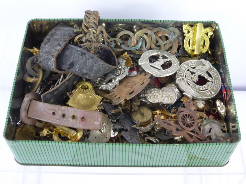 A Tin Containing a Large Collection Various Military Insignia, including badges and buttons etc.