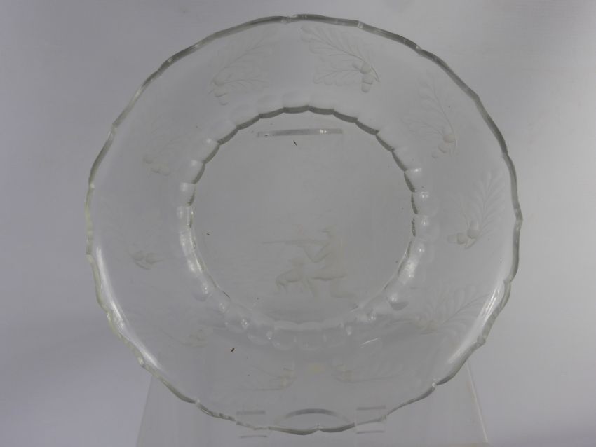 A Glass Fruit Plate, with decorative oak leaf border with a hunting scene.