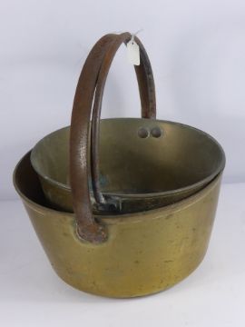 Brass Fire Irons, together with two brass preserving pans.