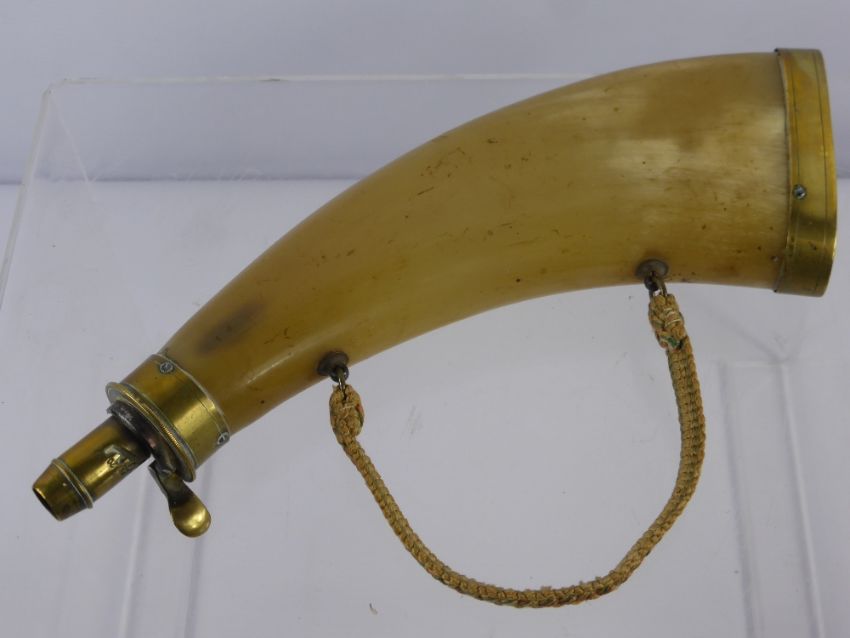 A Continental Horn Powder Flask, with embroidered fabric handle and brass mounts.