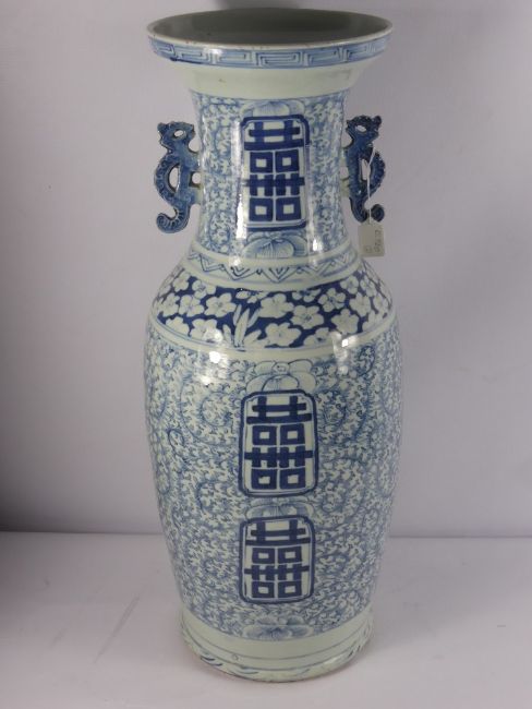 A 20th Century Blue and White Vase, with dragon handles, central band of prunus blossom and character marks to side, approx 90 cms.
