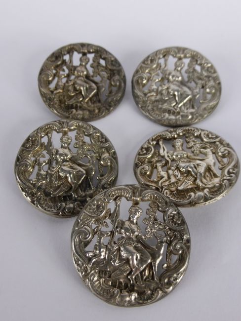 A Set of five silver Antique Buttons, London hallmark dd 1902, mm M.F., approx wt 31 gms.