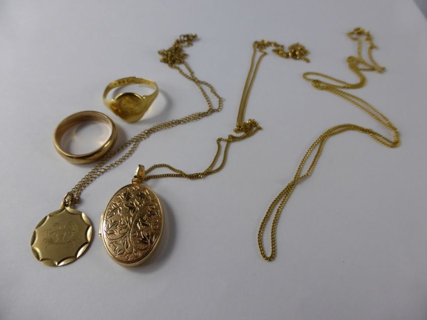 A Collection of Miscellaneous Gold Jewellery, including wedding ring, size R, Cancer Zodiac pendant on chain, locket and chain, chain, total wt 14 gms, together with an 18 ct gent's ring 3.5 gms. (WF)