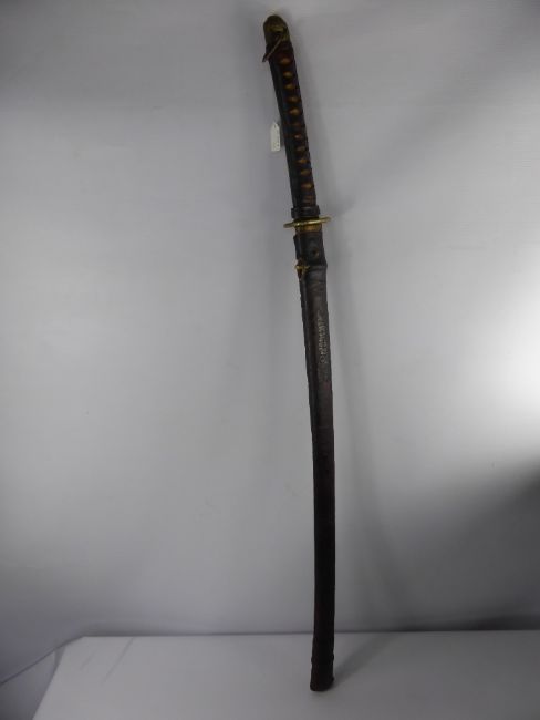WWII Japanese Officer's Katana Sword, with shark skin and leather covered grip, brass tsuba. Blade in good condition and sharp. Leather covered bamboo scabbard with brass belt ring.