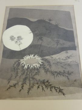A Collection of Miscellaneous Pictures and Prints, including Jelle Metman acrylic on board "Zomeravond" (Summer Evening) approx 40 x 30 cms, wood block print depicting floweers Parziale, approx 49 x 34 cms, black and white print depicting a sunflower, approx 50 x 60 cms and etching depicting Lak Meggori by Rodwell & Martin, approx 27 x 20 cms. (4)