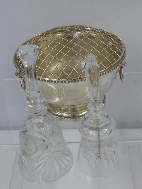 A Silver Plated Rose Bowl with lion mask handles together with two cut glass bells. (3)
