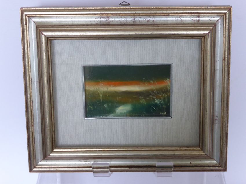 Gianni Parziale 1934 - Italian, Original acrylic on canvas, dated 1979, approx 13 x 13 cms, signed lower right, framed and glazed together with an original oil on board depicting a lake shore scene, signed Wimpole, lower right, approx 13 x 8 cms, framed and glazed. (2)
