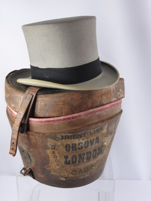 A Grey Top Hat, in original leather carry box inscribed to top interior 'By Scott & Co., Hatters to H.M. The King and The Royal Family'.