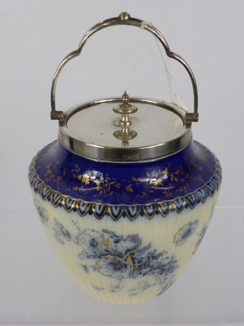 A Victorian Marble Glaze and Brown Ceramic Tobacco Jar, with a lockable screw down lid together with a Doulton Burslem Biscuit Barrel. (2)
