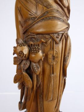 An Antique Oriental Okimono, carved wood figure depicting a wise man, approx 20 cms high. (af) Provenance: From a private collection belonging to the Late Dermott Levins, avid Oriental collector, Levins bought from notable London galleries and auction houses in the mid-1940's including Glendining & Co New Bond Street, Yamanaka & Co New Bond Street and later Sothebys.
