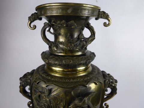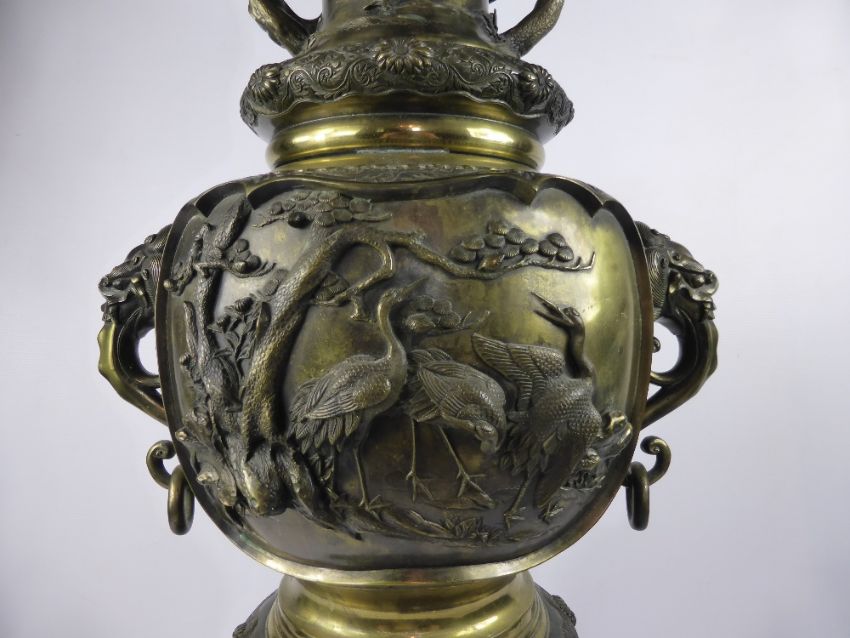 A Fine Japanese Endo/Meiji Period Bronze and Brass Floor Vase, the three sectioned vase having key form design to lip with raised naturalistic handles and blossoming prunus design in relief to the neck, the body of the vase depicting a group of cranes to central cartouche and an eagle challenging a dragon clasping a pearl to the other, stylized ringed handles, the whole resting on a floral lip, the base depicting a dragon resting on rocks in heavy relief, with key form and petal design to base, approx 73 h x 21 d to the top x 33 d. Provenance: From a private collection belonging to the Late Dermott Levins, avid Oriental collector, Levins bought from notable London galleries and auction houses in the mid-1940's including Glendining & Co New Bond Street, Yamanaka & Co New Bond Street and later Sothebys. Copy of the original purchase receipt from James Lord, Manchester dated January 1944.