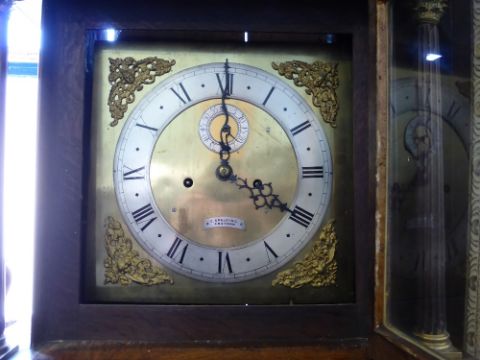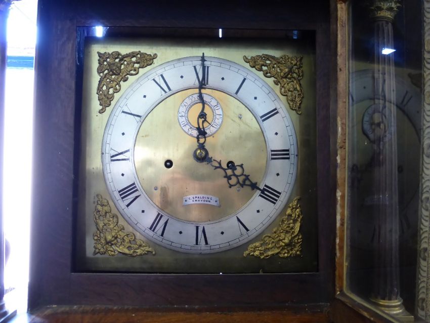 S. Spalding, Croydon, Oak Long Case Clock, the clock with split pediment, column supports and decorative carving to case, brass and silvered face with Roman dial, date aperture and gilt brass spandrels, approx 220 x 48 x 29 cms with weights and pendulum.