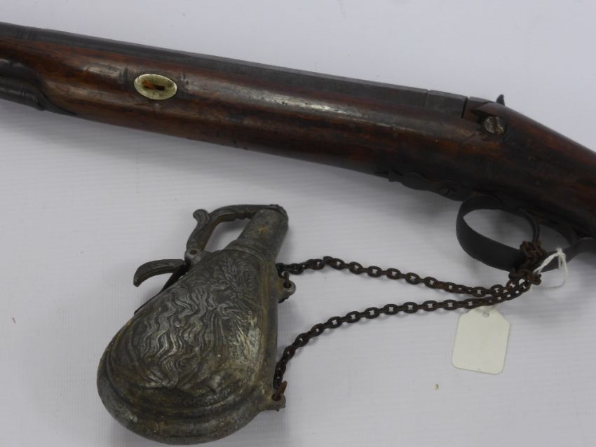 An Antique Muzzle Loading Shotgun, together with a pewter powder flask depicting Venus and a bearded man.