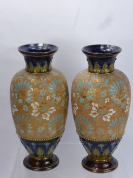 A Pair of Royal Doulton Lambeth Ware Vases, the vases having floral gilded decoration to body with leaf form to neck and base, impressed marks 4461 and signed H.D., approx 30 cms high.