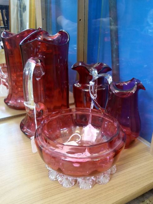 A Quantity of Victorian Cranberry Glass, including a bon bon dish, water pitcher, two creamers.(4)