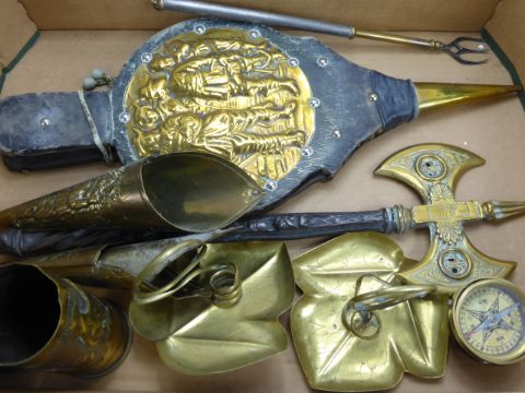 A Quantity of Brass, including a trivet, bellows, candle stick, shell cases and wall sconces, approx 10 cms