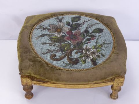 An Antique French Bead Work Foot Stool, on turned feet, approx 34 x 15 cms.